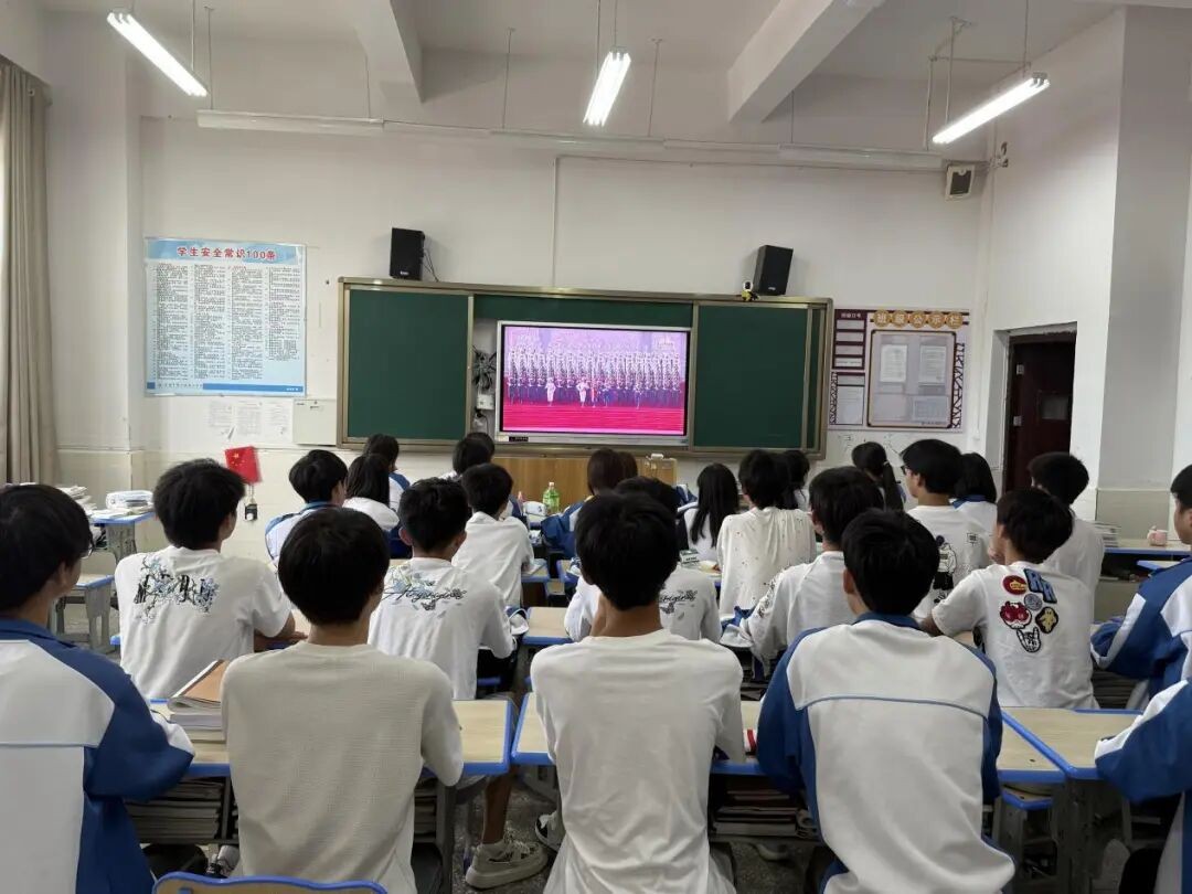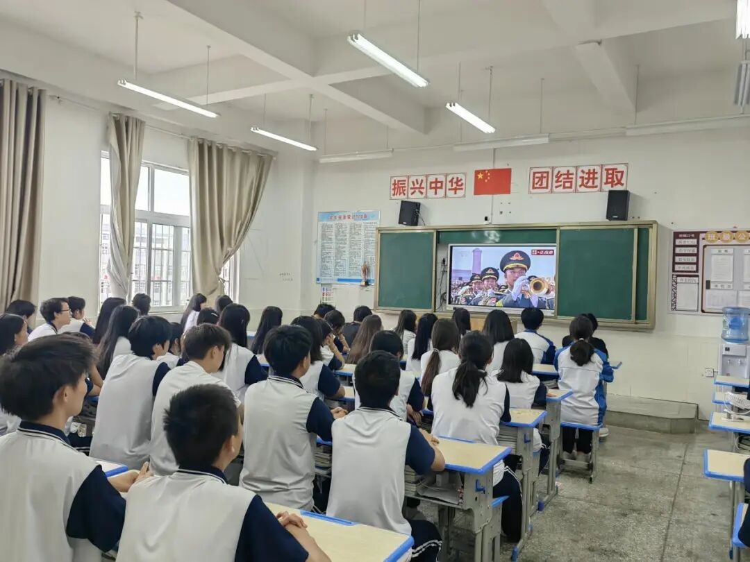学校在国防礼堂设立集中观看主会场,在党员活动室、各班教室设分会场,全体师生着装整洁、大方,会场庄重而肃静,当激昂的国歌声在天安门广场响起,五星红旗冉冉升起,学校全体师生一同起立,面向屏幕,行注目礼,齐声高唱国歌。此刻,对祖国的热爱、对先烈的缅怀,都凝聚在这肃穆而神圣的仪式感中。