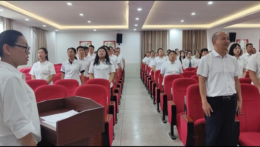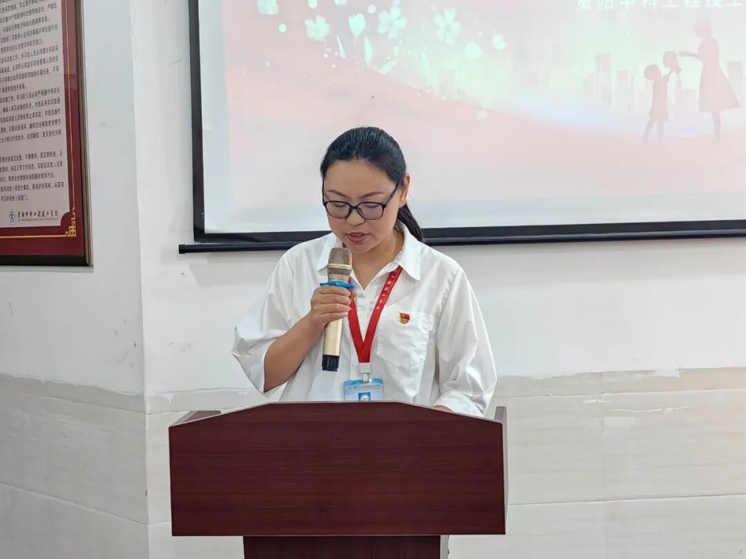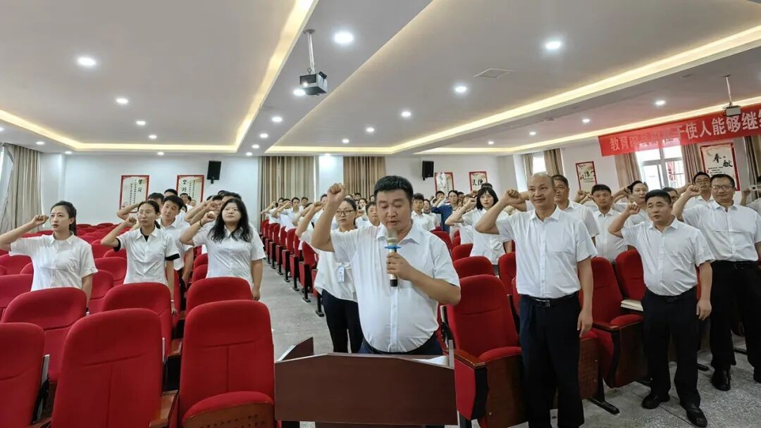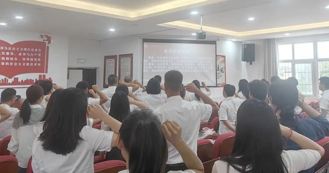 随后,顾辉校长带领全体教师重温《贵州教师誓词》:“我是一名光荣的人民教师,我庄严宣誓,忠诚党的教育事业,贯彻党的教育方针,履行教师神圣职责。修身立德,为人师表;追求真理,崇尚科学;敬业爱生,教书育人;淡泊名利,严谨治学;传承文明,勇于创新;终身学习,不断进步。为全体学生美好未来,我愿奉献全部智慧和力量!”。教师们举起右拳,庄严宣誓,铿锵有力的誓言体现了全体教师不忘为党育人、为国育才的初心使命,展现了敢于拼搏、潜心育人的决心和信心。