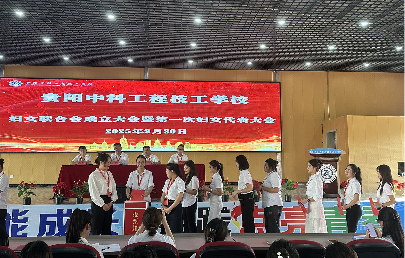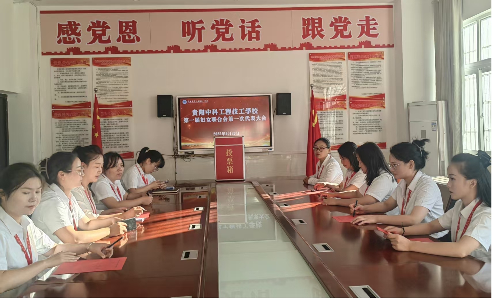 在严格遵循选举流程、充分发扬民主的基础上,选举工作顺利完成。大会选举产生贵阳中科工程技工学校第一次妇女代表大会第一届执行委员会委员11名,分别是:周鸿、陈丹、高黄丽、蒋小慧、赵春兰、杨飘、何敏红、宋秋萍、张旭、潘继依、杜天兴。在随后的妇女联合会第一届执行委员会第一次全体会议上,学校办公室主任周鸿当选学校妇联主任,陈丹、高黄丽、蒋小慧当选学校妇联副主任。