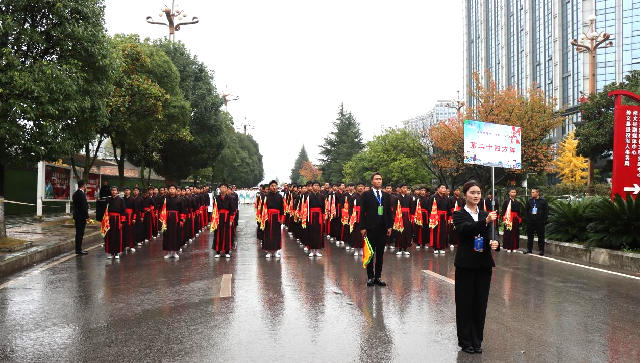 黔山毓秀,秋雨如诗。11月8日,修文县“诵阳明经典·传知行之魂”阳明经典诵读巡游活动在细雨浸润中拉开帷幕。贵阳中科工程技工学校两百余名师生身着统一服装,整齐列队,以坚定的步伐和铿锵的诵读,在这场文化盛宴中展现了技工学子的精神风貌与文化担当。