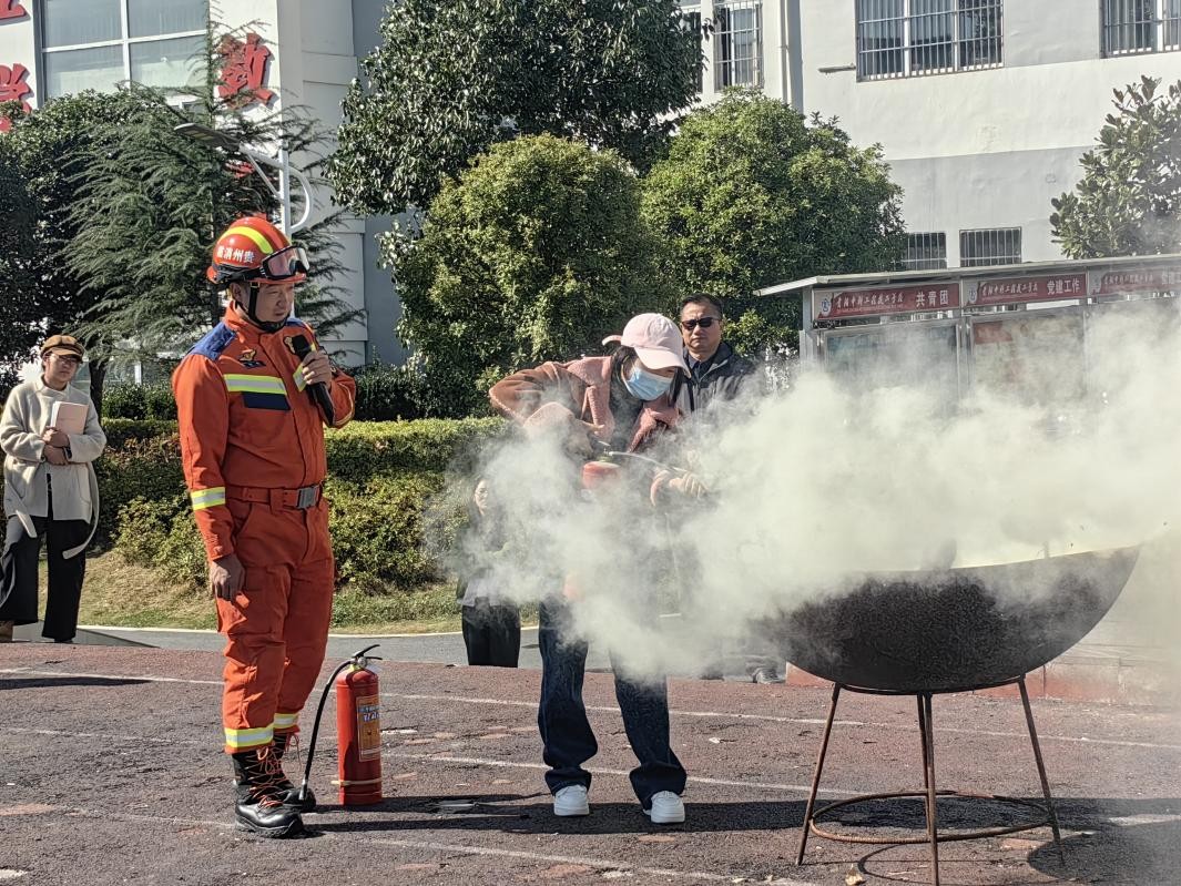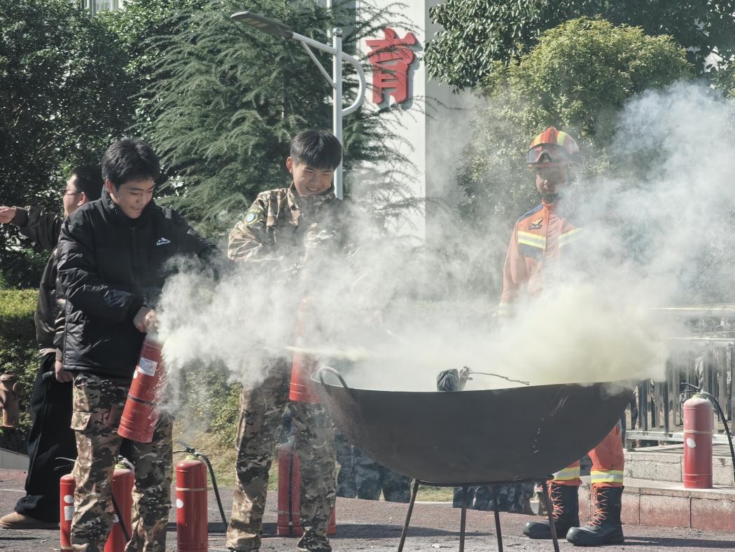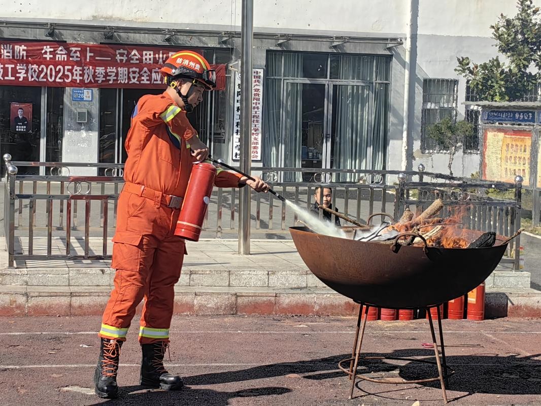 师生集结完毕后,修文县消防救援大队的消防队员随即开展消防安全实操培训。消防队员结合典型校园火灾案例,详细讲解了火灾成因、初期火灾扑救技巧及日常防火注意事项,并现场示范了干粉灭火器的“提、拔、握、压”使用方法。在消防队员的指导下,部分师生代表亲自上手操作灭火器,切实掌握了基本灭火技能,有效提升了应急处置的实战能力。