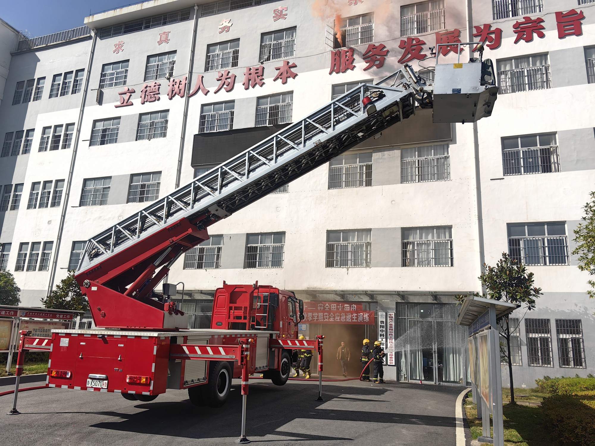 接到警情后,修文县消防救援大队的救援车辆呼啸而至,消防水车随即展开作业,高压水柱精准喷射至教学楼模拟着火区域;云梯消防车快速架设,消防队员借助云梯对“被困”在高层的模拟人员实施安全转运,专业规范的操作让在场师生直观感受到应急救援的高效与严谨。龙场镇卫生院的医护人员则在现场待命,随时准备应对可能出现的突发状况,为演练安全提供了坚实保障。