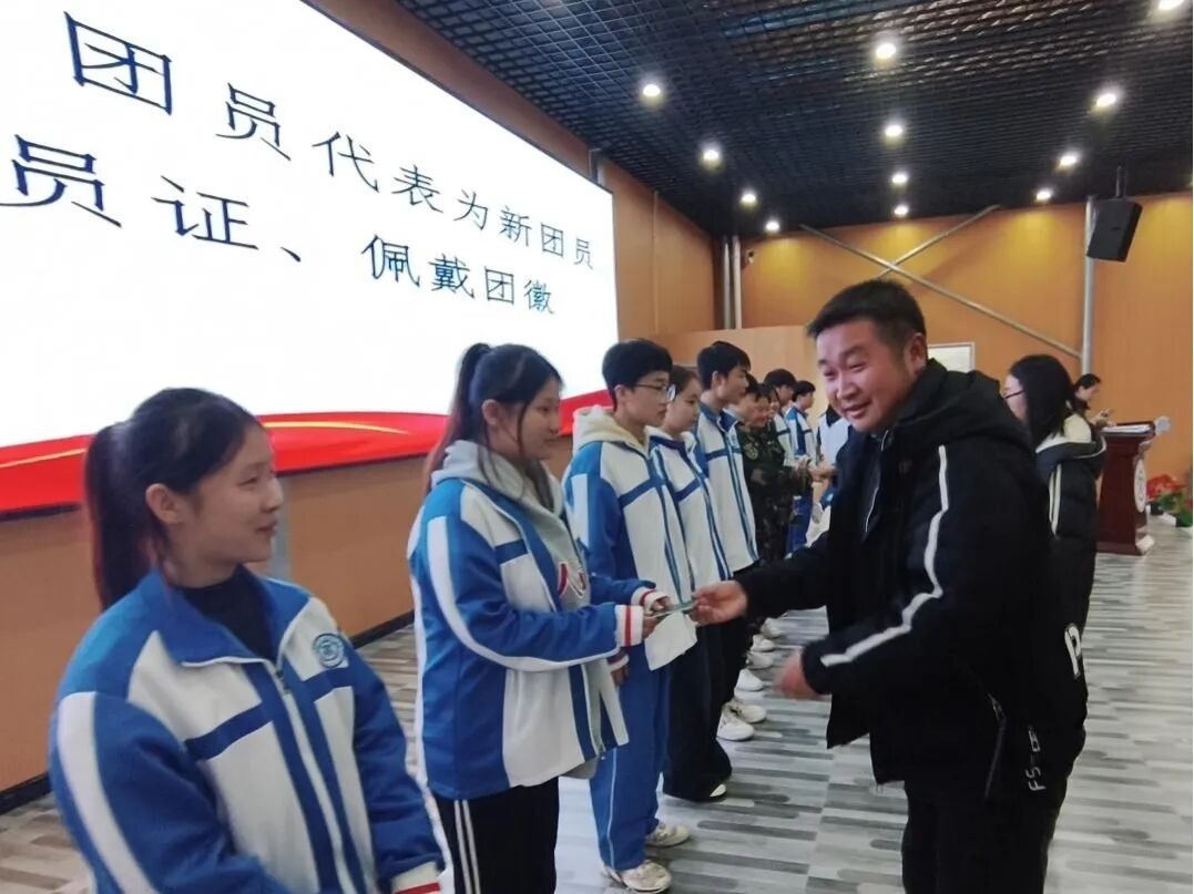 在热烈的掌声中,党员教师代表与老团员代表为新团员逐一颁发团员证、佩戴团徽。闪耀的团徽佩戴于胸前,不仅是一份荣誉,更承载着新时代青年的责任与担当。